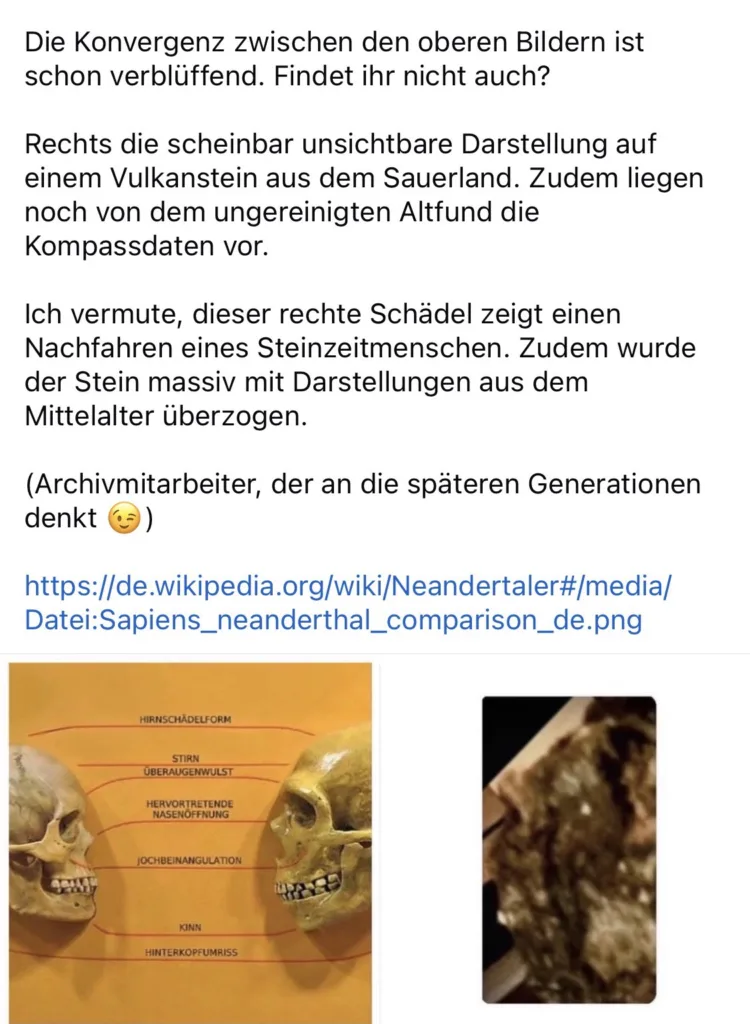 „Run away, Moon.“ Die vor Jahrhunderten handgeformte Mondmaske aus Lehmstein stammt aus der bergischen Region unseres schönen Sauerlandes. Einen Steinwurf von meiner Wohnung entfernt befindet sich der einstige Fundort. Der Finder barg die Maske in einem Gesteinshaufen. Erwähnenswert finde ich, dass der Finder auch eine Steinsohle in der Größe von 38,5 cm entdeckte. Auf diese Tonsohle werde ich auch noch einmal ausgiebig eingehen. Es handelt sich um einen legalen Altfund aus längst vergangenen Zeiten. Die Oberfläche des unverwüstlich erscheinenden Steins sieht bei Nässe wie aalglatt lackiert aus. Gebrannt wurde die Mondmaske bestimmt in einer speziell angefertigten Brennkammer. Auffallend schwer ist auch der Stein. Der Mond bestimmt bekanntlich unseren biologischen Rhythmus.…